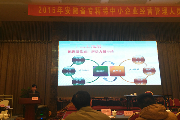 2015年安徽省专精特中小企业经营管理会议近日在安徽六安举行,安徽省经信委副主任吴韦人、六安市副市长束学龙、省中小企业局副局长张立明、省质量管理协会秘书长李代忠以及全省专精特中小企业董事长或总经理共206人出席了会议。我院财经分院院长李德明教授作为唯一的院校代表应邀出席了会议,并针对“十三五”时期企业如何转型提升、增强竞争能力作了专题讲座。