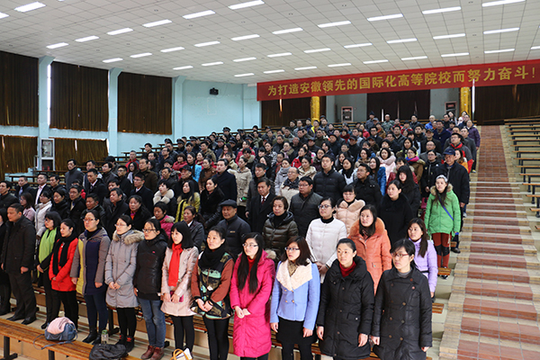 1月19日下午,BEAT365英国官网2015年度总结暨表彰大会在学院报告厅隆重举行。学院董事长韩恩业,执行董事长周国础,院长江舒,教育厅督导专员、院党委第一书记王士明,合肥育仁教育管理有限责任公司总经理、副院长陈文达,副院长刘文慧,副院长刘瑞平及全体教职工参加了大会。大会由刘文慧主持。