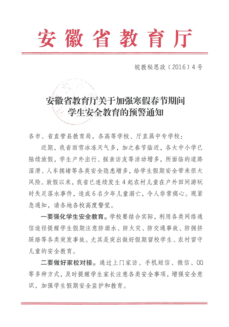 安徽省教育厅关于加强寒假春节期间学生安全教育的预警通知