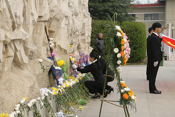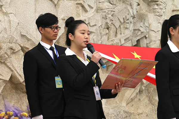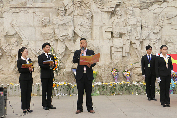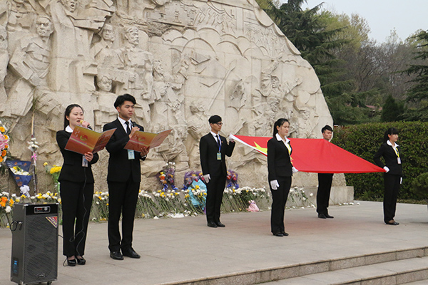 在邓小平同志题写的“江淮英雄永垂不朽”的英雄纪念碑前,600余名学子齐声高唱中华人民共和国国歌,迎接神圣的国旗,随后全体默哀一分钟,由学生代表向英雄纪念碑敬献花束以表哀思。