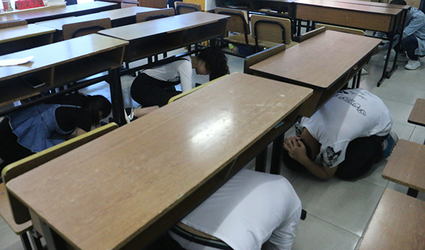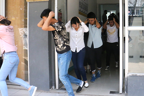 12时35分,警报声想起,教室里的学生开始就近应急避震,双手抱头蹲在各自的课桌下,在相对牢固的地带躲避起来。随后,学生在学院老师的组织下,迅速、有序地撤离教室,疏散到较为空旷的运动场集合。