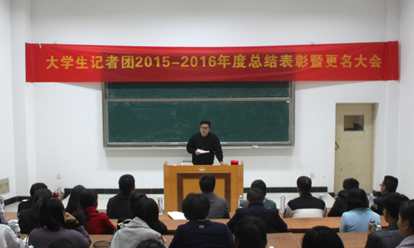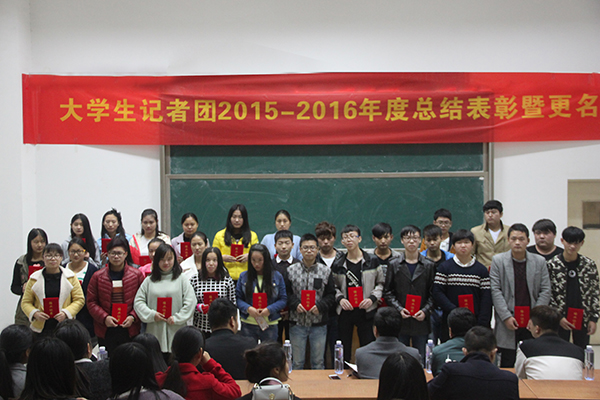 11月2日晚,我院大学生记者2015—2016年度大学生记者团总结表彰暨更名大会团在1201教室隆重举行,院宣传部部长、继续教育部部长余得高,院宣传部老师汪启军,院、系学生会主席团,以及社团联合会、校卫队、各学生会宣传部部长、各班级委员和全体大学生记者团成员等参加了此次大会。