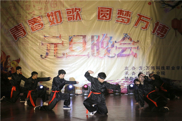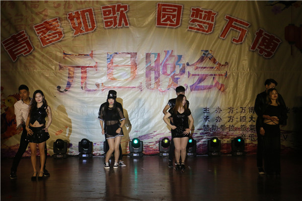 晚会在18点30分准时开场,充满活力、激情四射的开场歌曲《Good boy》瞬间点燃了现场的气氛。随后,动情的演唱、火热的舞蹈、幽默的小品……各种节目轮番登场,你方唱罢我登场,现场气氛十分热烈。整场晚会节目内容丰富,流行与古典兼具,温情与火热并举,形式多样,精彩纷呈。舞蹈、歌曲节目或浪漫温馨,或轻快悠扬,或活泼动感,风格各异,变幻多姿。《上课》、《甄嬛传》、《咋了爸爸》等小品更是让观众乐开怀,其,幽默风趣的台词,滑稽搞笑的表演引得现场观众掌声如雷;街舞节目刚健有力,将万博学子的风采展现的淋漓尽致;引爆全场的拉丁舞表演以及扇子舞表演惊艳亮相,演员们跳出了青春的舞步,跳出了生命的色彩,跳出了专属于她们的靓丽风姿,博得现场掌声雷动;歌曲《七里香》、《飘洋过海来看你》等也是亮点频频;相声表演《我要懂规矩》、三簧等以诙谐幽默的语言和肢体在嬉笑吵闹的同时传达出为人处世的哲学。