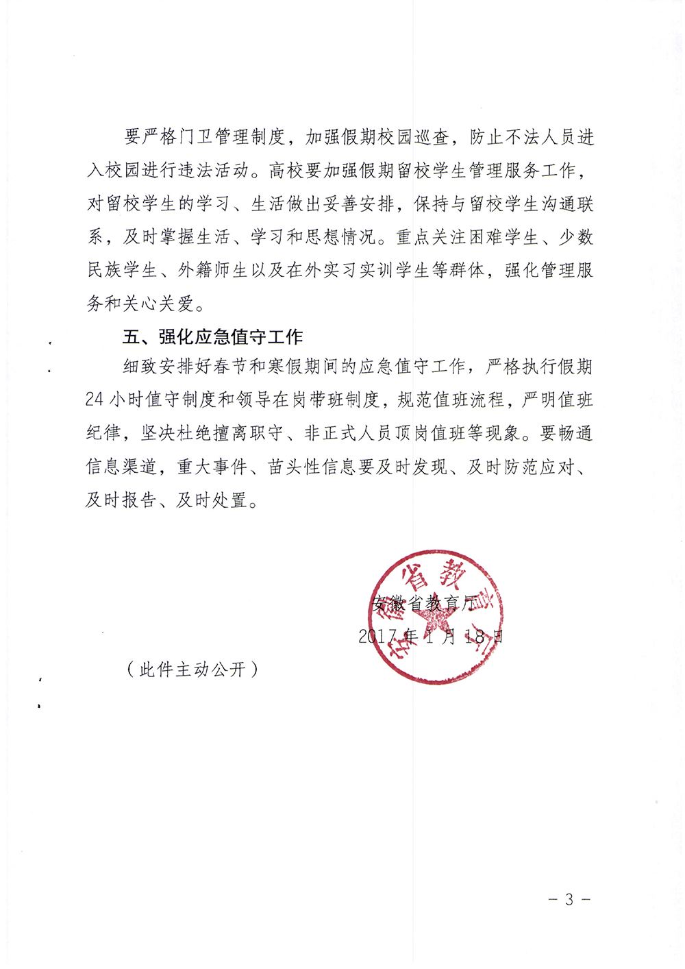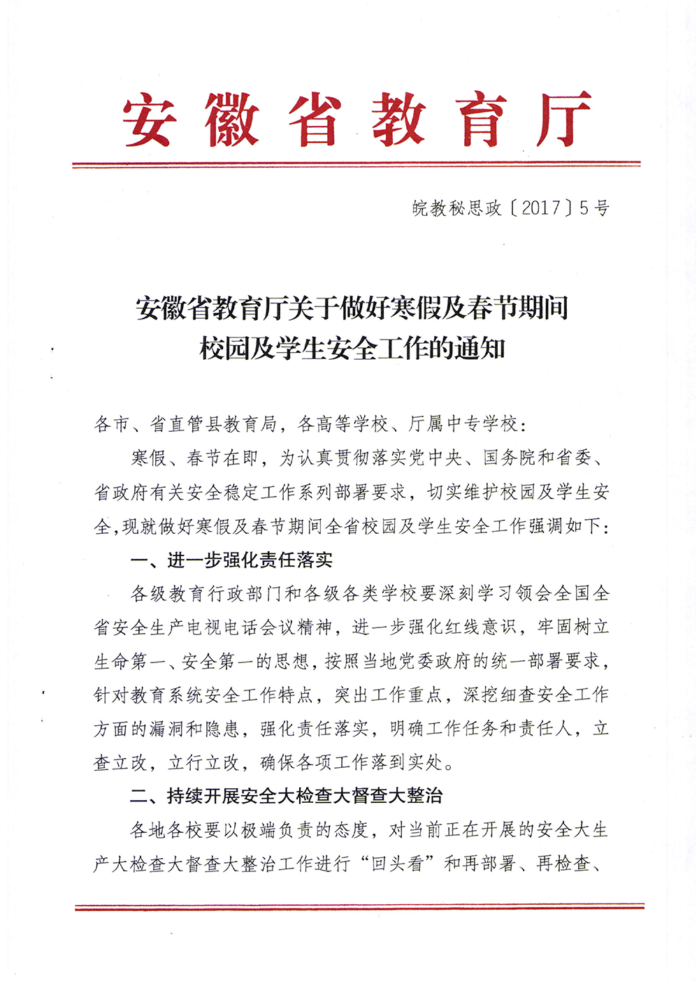 附件:《安徽省教育厅关于做好寒假及春节期间校园及学生安全工作的通知》
