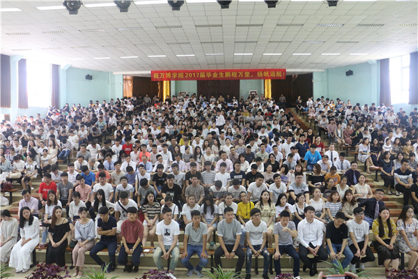 江院长表示,今年是党的十九大召开之年,万博学院也迎来了新的发展时期,毕业生迎来一个好年代。过去的三年,同学们度过了人生中最难忘的青春时光,在同学们即将离开母校、扬帆远航之际,向同学们提出几点期望:一是希望同学们坚持梦想、铭记责任与担当。从校园走向社会是人生重要的转折点,在新的工作岗位上要紧跟时代,树立与时代主题同心同向的理想信念,勇于担当时代赋予的历史责任,锐意进取,报效祖国,服务社会,在激情奋斗中绽放青春光芒,为创造更多的社会价值而不懈努力;二是希望同学们励志勤学,刻苦磨炼,勇于创新。知识改变命运,人品、能力成就未来,毕业后要及时更新知识储备,在学中干、干中学,不断优化自己的知识结构,用创新意识将工作做出特色、做出水平。在新的工作岗位上要增强信心,宽厚待人,真诚为人,脚踏实地、求真求知,在实践和积累的基础上迸发灵感,争取在平凡的岗位上做出不平凡的业绩;三是希望同学们崇德遵法,保持良好的道德情操。同学们要带头遵纪守法,法律红线不可逾越,法律底线不可触碰,成为勇于挑战、百折不挠的强者;四是希望同学们学会感恩,为母校增光添彩。走出学校后,就要努力学会自信、自强、担当、感恩,迎接人生新的挑战,做一个为母校增光添彩,勇于承担起社会责任的人,时刻牢记习近平总书记的教诲,“心中有阳光,脚下有力量,为了理想能坚持、不懈怠,才能创造无愧于时代的人生”。最后,江院长希望同学们常回母校看看,并祝愿全体毕业生在人生新的征程中,一帆风顺、鹏程万里。