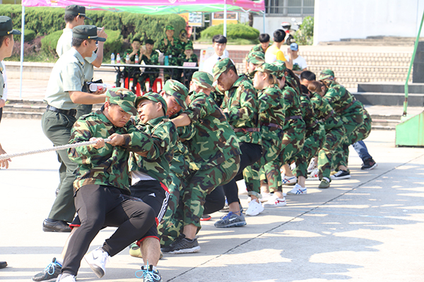此次比赛,参赛队伍以连队为组别,共有7队参加,当比赛的哨声响起,只见参赛的队员们紧握长绳,卯足了劲拼命往后拉,各连队教官也在队伍旁边加油助阵。