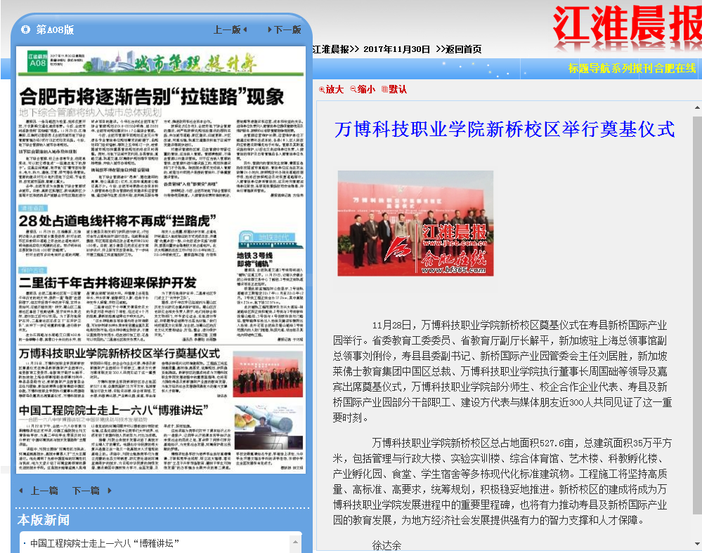 江淮晨报/合肥晚报11月30日第A08版发布题为《BEAT365英国官网新桥校区举行奠基仪式》,电子版报纸地址为:http://epaper.hf365.com/jhcb/html/2017-11/30/content_354773.htm