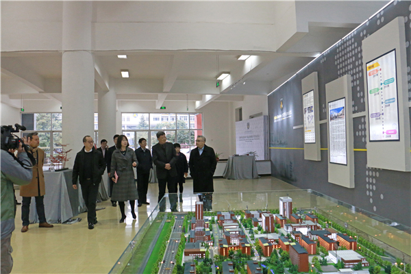 周华盛董事长一行首先参观了位于学院图书馆一楼的展厅,参观了学院的发展历史、学子风采、校园生活、学生作品等展板,重点了解了学院新桥校区的基本概况、发展目标、建设进度以及远景规划等情况。