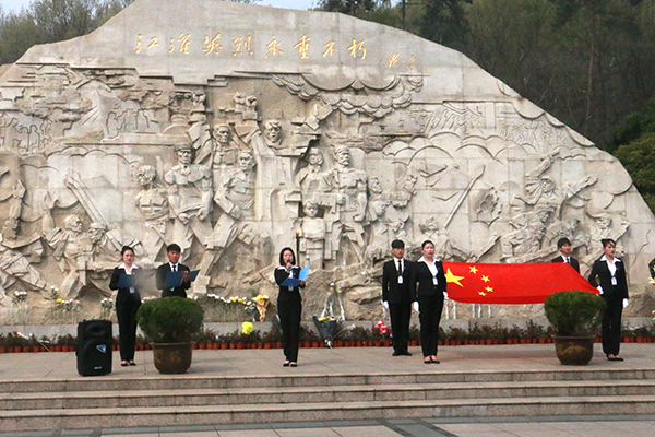在邓小平同志题写的“江淮英雄永垂不朽”的英雄纪念碑前,同学们齐声高唱中华人民共和国国歌,迎接神圣的国旗,随后全体默哀一分钟,并由学生代表向英雄纪念碑敬献花束以表哀思。