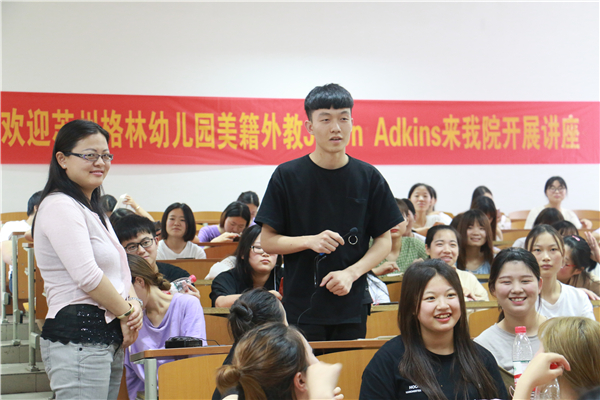 6月21下午,苏州格林幼儿园美籍外教Jason Adkins老师来我院为2017级幼儿发展与健康管理专业的同学举行了一场精彩的主题讲座,帮助相关专业的同学们对幼教事业有了进一步的认知,并通过讲座对幼教这一职业有了更加直观、深刻的体验。