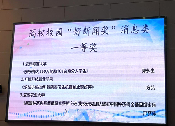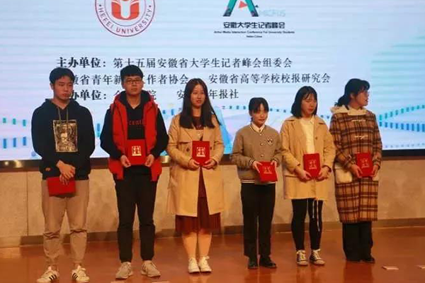 11月11日,由安徽大学生记者峰会、安徽省青年新闻工作者协会和安徽省高等学校校报研究会联合主办,合肥学院、安徽青年报社联合承办的第十五届安徽省大学生记者峰会于合肥学院南艳湖校园隆重举行。应峰会组委会邀请,我院大学生记者团学生记者方弘、傅斌、葛莹和张业琦四位同学参加此次峰会,我院方弘同学提交的新闻稿件荣获高校“好新闻奖”消息类一等奖的好成绩。