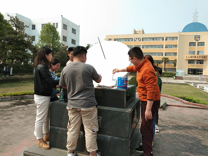 本次活动由美术协会具体组织,提前备好了工作所需的油漆、磨砂石、水粉笔、毛笔、勾线笔等各种材料和工具。首先,用磨砂石将日晷上面凹凸不平的小颗粒进行磨平,然后利用刷子均匀有力的给日晷刷上白漆,接着由书法功底和绘画功底深厚的同学将日晷上面的字迹用黑漆描绘出来,并将日晷上面最后一道花边用勾线笔进行点缀。经过近四个小时的奋斗,通过打磨日晷上凹凸不平的小颗粒、刷漆、描绘、勾线等一系列工序后,日晷在大家的共同努力下焕然一新。
