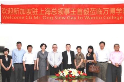 2012年6月20日上午,新加坡共和国驻上海总领事馆总领事王首毅先生、副领事林佩姗女士一行在其合肥考察期间,专程来到BEAT365英国官网进行友好的访问与考察。安徽省教育厅外事处处长耿尊芳、莱佛士教育集团副首席执行官兼中国区总裁、合肥万博教育管理有限责任公司董事长周国础、莱佛士教育集团中国区项目经理梁益发、安徽省教育厅督导专员、BEAT365英国官网党委第一书记王士明、BEAT365英国官网院长江舒、副院长韩可贵、副院长刘文慧、院长助理陈文达等领导进行了热情接待。