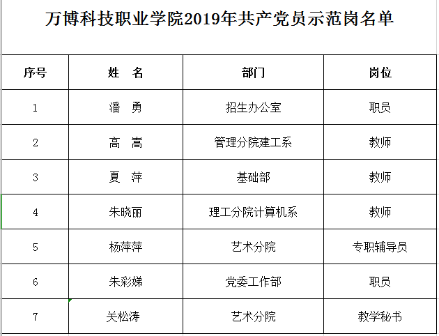 自组织开展“党员示范岗”创建活动以来,各支部坚持把创建活动与加强思想教育、推动业务工作相结合,精心安排,扎实推进,有力地促进了各项工作顺利开展,进一步增强了基层党组织的凝聚力、战斗力和吸引力。为进一步加强学院党的建设,推进“两学一做”学习教育常态化制度化,落实“党支部建设年”工作和即将开展的“不忘初心、牢记使命”活动,推动学校各项工作质量全面提高,经各党支部推荐和院党委研究,决定命名潘勇等7名同志为2019年学院“共产党员示范岗”。