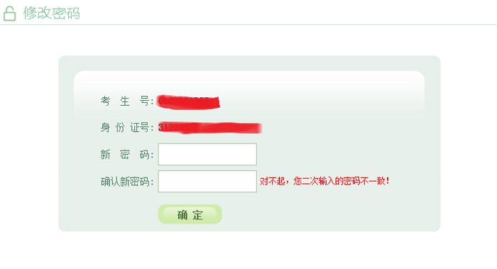 输入考生号,身份证号,点击“发送短信验证码”按钮后,系统会随机发送6位数字验证码至考生报名时所填的手机号上;填写完短信验证码,点击“确定”,跳转至考生修改密码页面,设置考生登录密码。短信验证码只能发送5次,请考生谨慎操作。