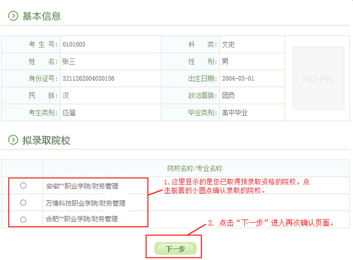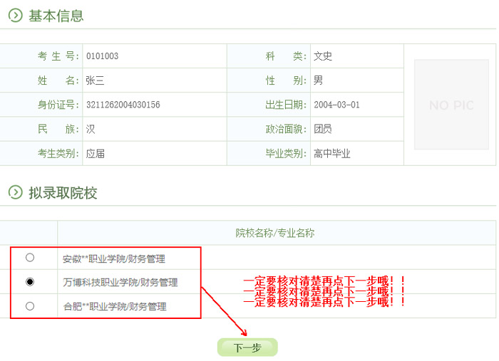 特别提醒:高职扩招录取确认只有在规定时间内(8月26日-27日),在规定网站(gkbm.ahzsks.cn)上操作方为有效。请各位考生一定要妥善保管自己的考生号、身份证号等个人信息,切勿泄露给其他人,更不要委托他人代替自己确认。一旦确认了录取院校,是不能修改的!!!