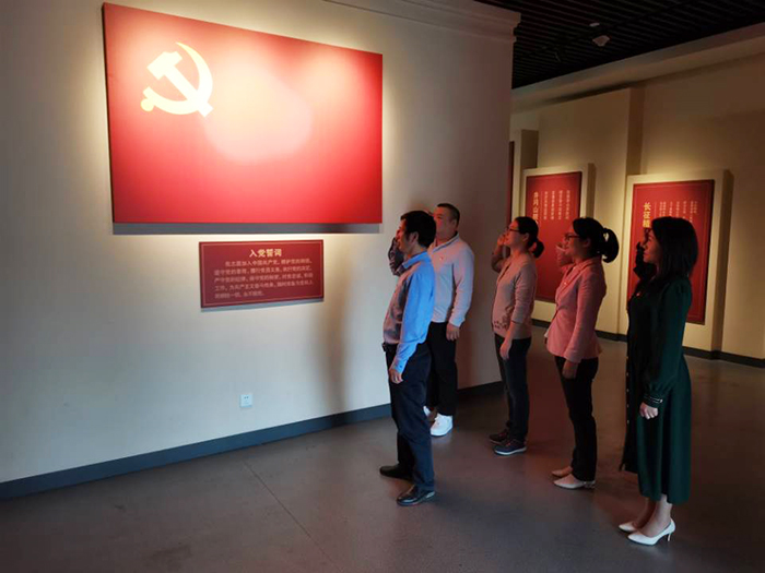 在博物馆一楼大厅,面对鲜艳的党旗,支部宣传委员裴孝清同志带领全体党员一起重温入党誓词,表达共产党人“不忘初心、牢记使命”的坚定政治信念,立下“初心如磐,使命在肩”的铮铮誓言。