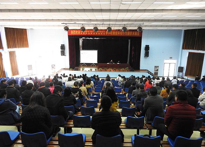 报告中,李教授引用《国家职业教育改革实施方案》中“职业教育与普通教育是两种不同类型的教育,具有同等重要的地位”,要“由参照普通教育办学模式向企业社会参与、专业特色鲜明的类型教育转变”,“要把职业教育摆在全省教育改革创新和经济社会发展全局更加突出的位置”,强调了职业教育的重要地位。同时向大家详细阐述了《安徽省职业教育改革实施方案》的主要内容,强调了方案的实施,体现了“六个突出”的主要特点,并将取得“六个重大突破”的显著效果。