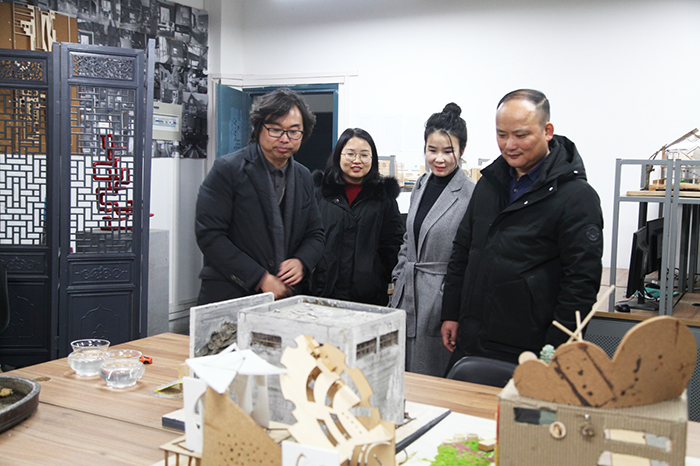 为全面了解高职院校艺术类专业办学特色,增进对实验实训教学工作的交流与探讨,加强BEAT365艺术类专业的教学内涵建设,提升专业水平,2019年12月31日,BEAT365校长助理兼教务部部长张进、实验室与网络管理中心副主任杜建春、教务部副部长张静、艺术传媒学院副院长刘静、艺术传媒学院教学助理兼广告传媒教研室主任关松涛一行5人前往安徽工商职业学院艺术设计学院进行实地考察与调研。