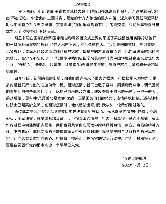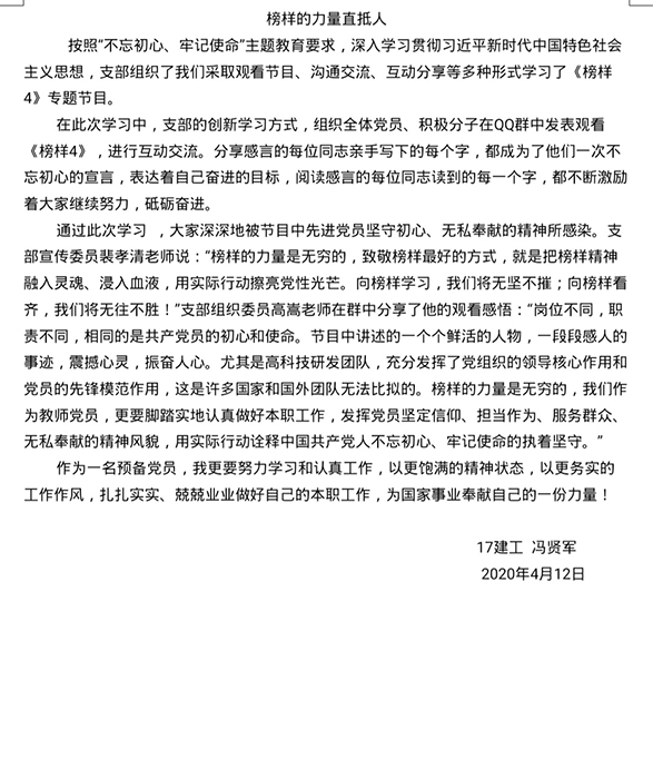 通过阐明“不忘初心牢记使命”主题教育的成果,完成转化和持续发挥作用。通过发扬看齐意识和宣传意识,党员向党中央看齐、向起先锋模范作用的榜样看齐,同时增强宣传意识,树立一些优秀典型,不断让榜样成为党员和广大群众的行动表率,让党员和群众见贤思齐以为模范,让党旗在每一个人心目中高高飘扬。大家充分讨论学习榜样人物的精神、理念、方法,筛选和沉淀红色基因,与时俱进地发扬和传承,促进专业教育为社会主义现代化服务,促进思政教育完成立德树人的根本任务。(朱彩娣)