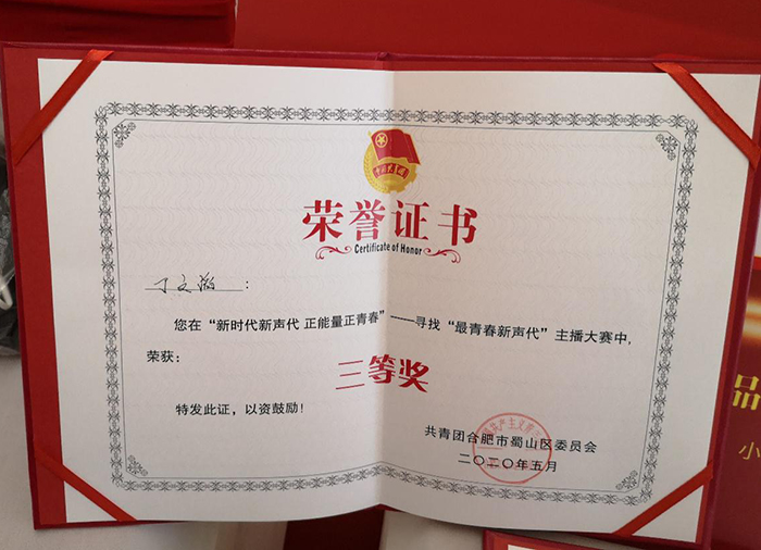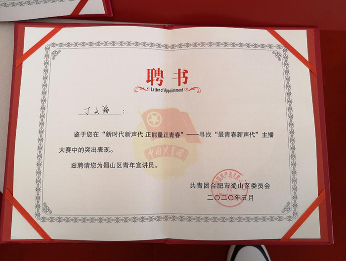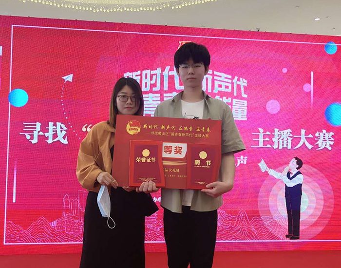5月30日下午,在由共青团合肥市蜀山区委员会联合喜马拉雅、抖音、合肥万象城党支部举办的“新时代新声代 正能量正青春”——寻找“最青春新声代”主播大赛决赛中,BEAT365交通工程学院18级城市轨道专业丁文滔同学不负众望,以参赛作品《旗帜》,在来自全区各高校竞争对手共计857条参赛作品中脱颖而出,荣获主播大赛三等奖,同时被聘为“蜀山区青年宣讲员”。