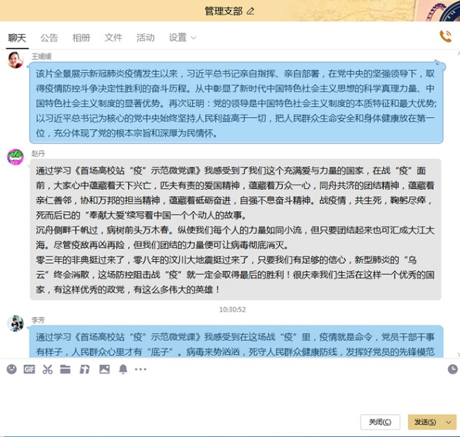 通过观看微党课,学生党员纷纷表示作为一名有理想、有本领、有担当的时代青年应该勇做这场“战役”的主力军,虽不能身赴战场,但也要科学防疫,听从学校和老师的指挥,积极参与疫情防控宣传工作,时刻不忘自身责任和担当。教师党员一致认为,“大考面前,每一个岗位、每一份职责,都是一个微型考场。一名党员就是一面旗帜,一次行动就是一份答卷,应在各自岗位担责尽职,发挥支部和党员作用,在大战中践行初心使命”。(朱彩娣)