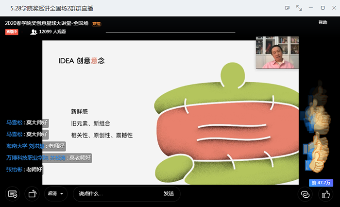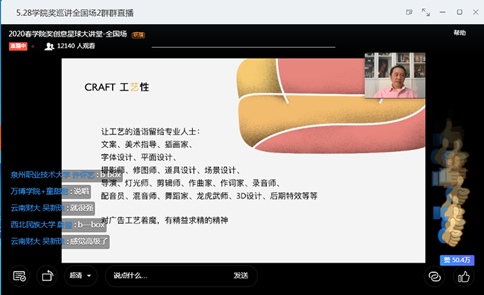 自从5月15日以来,大广节学院奖2020春季征集活动创意星球大讲堂线上巡讲活动已经为全国各区域的高校师生量身打造了20余次线上创意课, 各命题代表登陆直播间,在线为参赛的老师同学们讲述品牌故事、解析命题策略单、答疑解惑,学院奖组委会还邀请到了众多行业资深广告人、大咖创意讲师、学院奖评委,来到直播间,为同学们分享从业心得,解读优秀获奖作品,打开创意思维,同时也针对同学们在创作中遇到的问题和困惑进行解答互动,赢得了参赛师生的一致好评点赞。BEAT365广告设计与制作专业师生也受邀参加了其中8场创意星球大讲堂。