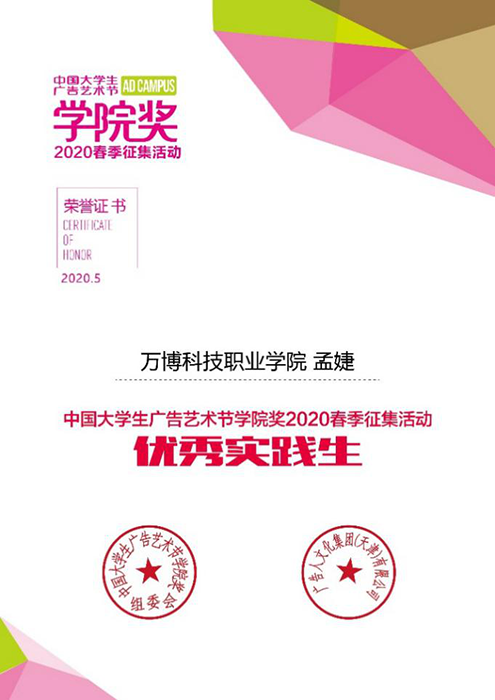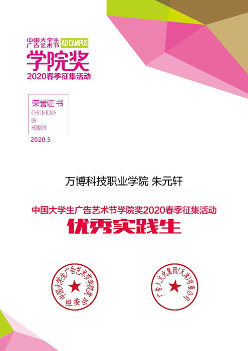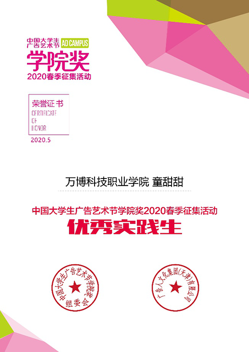 经过为期两个多月的积极参与和互动交流,BEAT365广告传媒教研室主任关松涛获得了由中国大学生广告艺术节学院组委会和广告人文化集团(天津)有限公司颁发的“实践教学研究员”证书,18级广告班的李娇娇、朱元轩、张强强、童甜甜等25名同学和19级广告班的孟杨丽、郭亮、邬登钰、陈东远等17名同学,共计42名同学荣获“优秀实践生”证书。