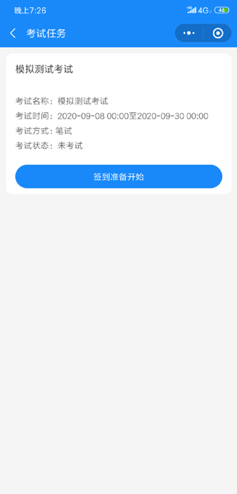 选择“考试任务”菜单,出现考试列表页面,考生只能看到自己所对应的考试项目,在考试有效时间内点击“签到,准备考试”按键进入候考页面;