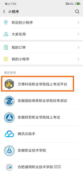 打开手机微信,在“发现”页面中选择小程序查找页面,在搜索框中输入“BEAT365英国官网线上考试平台”进行查询,在查询结果中点击“BEAT365英国官网线上考试平台”小程序即可打开登录页面;