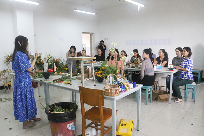 艺术传媒学院朱婉芬老师为到场的老师们解读了花卉选材、花卉搭配等知识,并现场讲解制作了瓶花、盆花和碗花。从工具至花材、从叶材到插花,将原本普通的花草修剪、整枝、花艺造型,形成了一幅幅独具匠心,又饱含艺术生活的花艺作品。