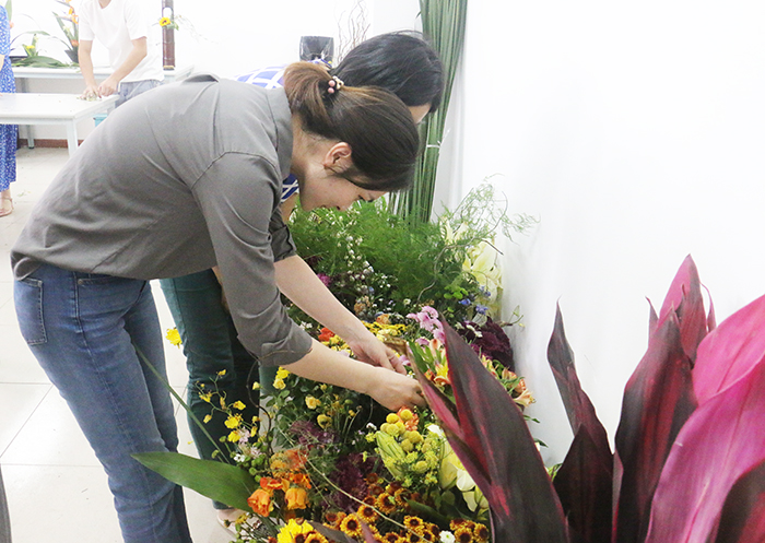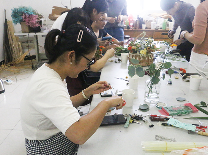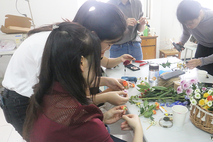 在随后的个人制作时间里,老师们挑选了各自心仪的花朵和佩饰,立即着手制作,活动现场气氛热烈,大家兴致勃勃,在艺术学院各位老师的耐心指点下,经过一番裁剪、配色、上胶、定型,终于得到了满意的成品。