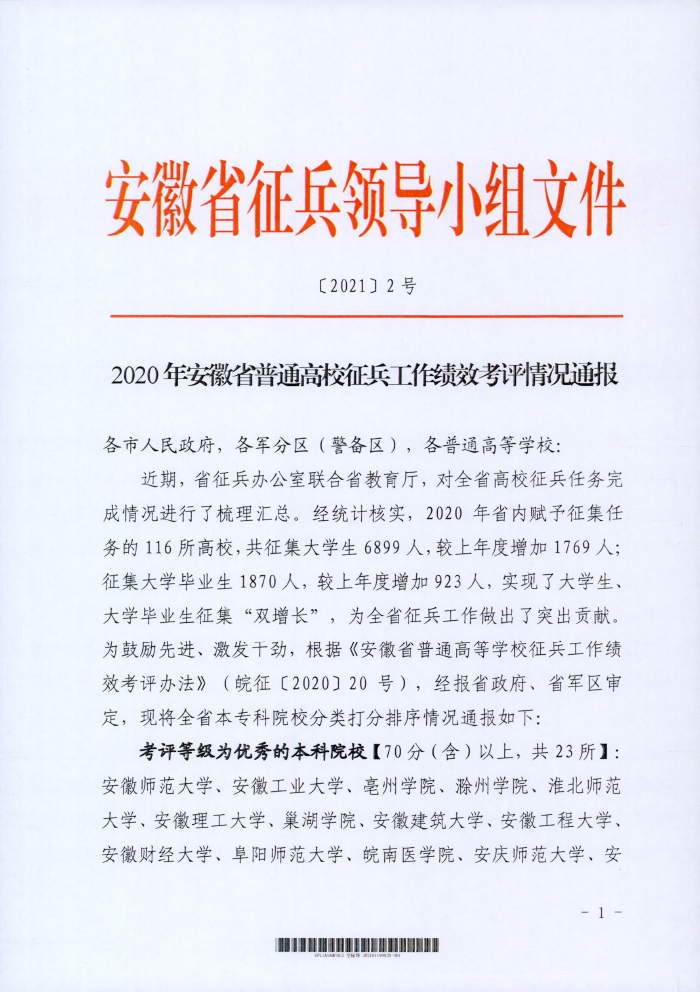 BEAT365英国官网积极落实大学生征兵任务,鼓励在校大学生投笔从戎。2020年,学校全年征兵计划为25人,实际入伍人数达到46人,超额完成上级部门下达的任务,在2020年安徽省普通高校征兵绩效评级中被评为“优秀的专科院校”。
