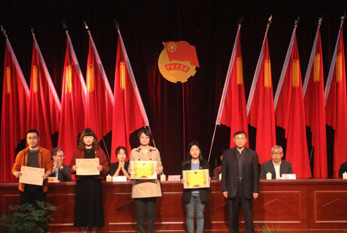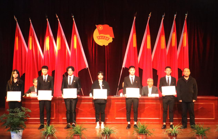 (省教育厅督导专员、校党委书记汤增产为校五四红旗团总支部、优秀团总支部书记代表颁发荣誉证书)