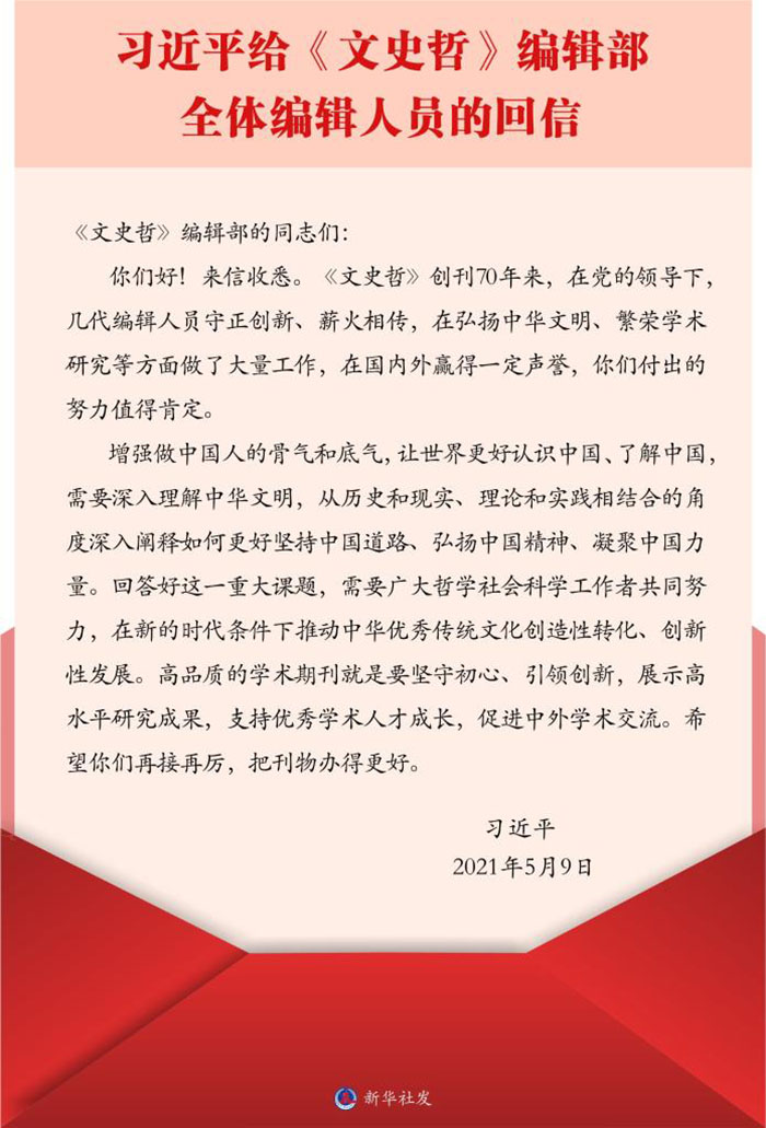 新华社北京5月10日电 中共中央总书记、国家主席、中央军委主席习近平5月9日给《文史哲》编辑部全体编辑人员回信,对办好哲学社会科学期刊提出殷切期望。