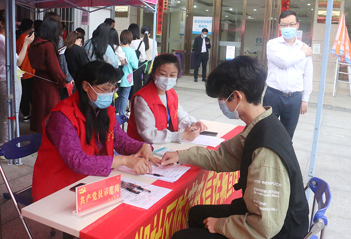 疫苗接种现场分为咨询登记区、体温测量区、信息录入登记区、接种区以及留观区。师生们分批次、排好队、戴好口罩有序地等待接种新冠疫苗。金湖社区志愿者为师生答疑解惑维持秩序,引导同学们佩戴好口罩,排队测量体温、签署疫苗接种知情同意书等学生返校相关工作。