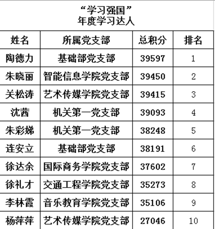 据介绍,结合“学习强国”平台,5月17日后,校党委对参赛学员的打卡期累计积分、支部学员参与度等指标进行综合考量,最终确定了个人及团体获奖名单,并产生“年度学习达人”称号10人,“积分打卡标兵”教职工和学生各10人,“活跃党支部”称号5个。