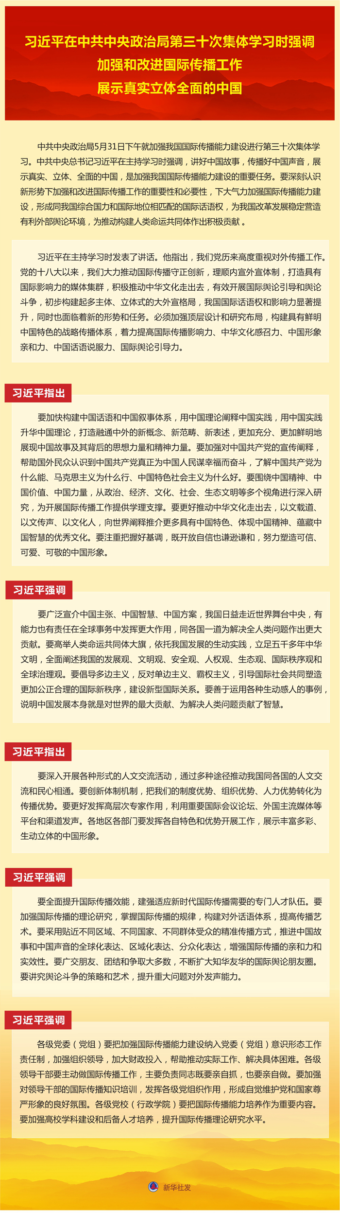 习近平在主持学习时发表了讲话。他指出,我们党历来高度重视对外传播工作。党的十八大以来,我们大力推动国际传播守正创新,理顺内宣外宣体制,打造具有国际影响力的媒体集群,积极推动中华文化走出去,有效开展国际舆论引导和舆论斗争,初步构建起多主体、立体式的大外宣格局,我国国际话语权和影响力显著提升,同时也面临着新的形势和任务。必须加强顶层设计和研究布局,构建具有鲜明中国特色的战略传播体系,着力提高国际传播影响力、中华文化感召力、中国形象亲和力、中国话语说服力、国际舆论引导力。