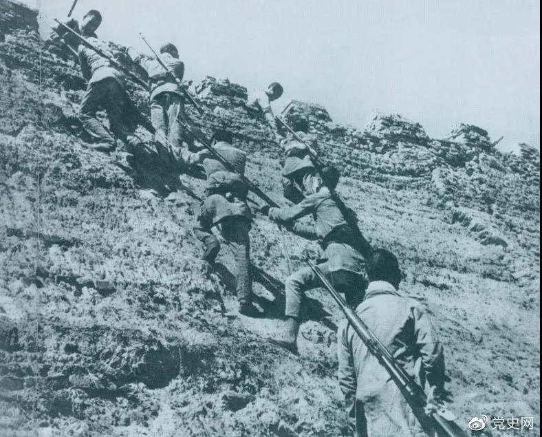 1945年6月25日,八路军冀中部队攻克河北献县。图为部队奋勇攀登城墙。