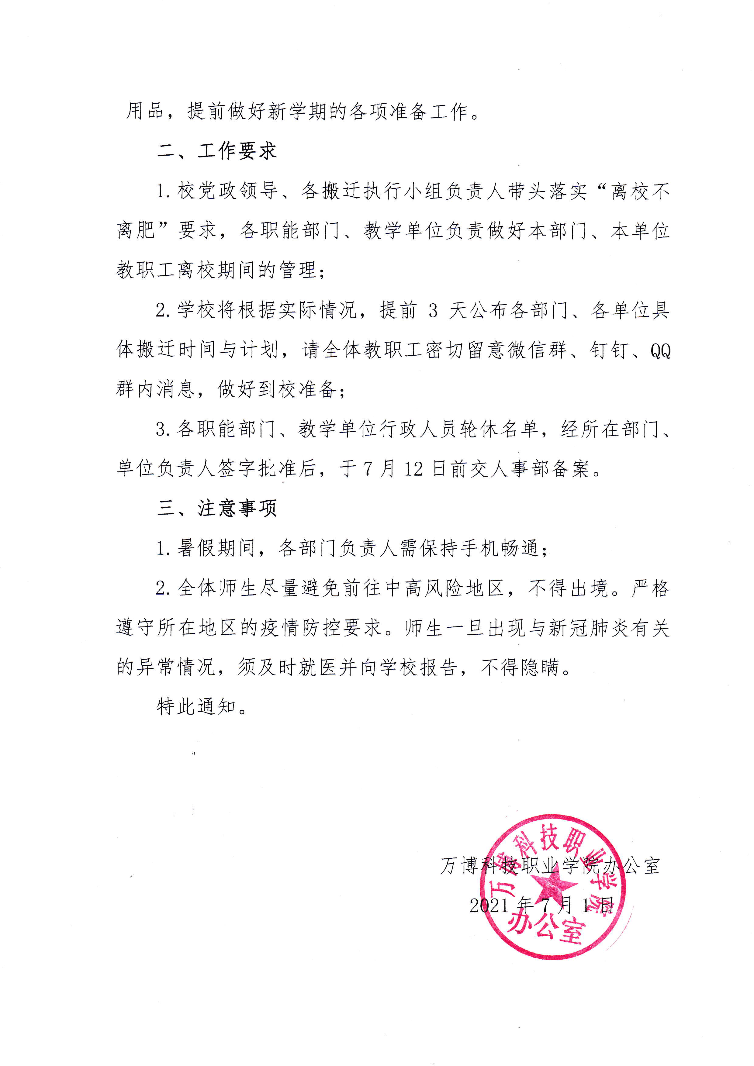 关于2021年暑假工作安排的通知