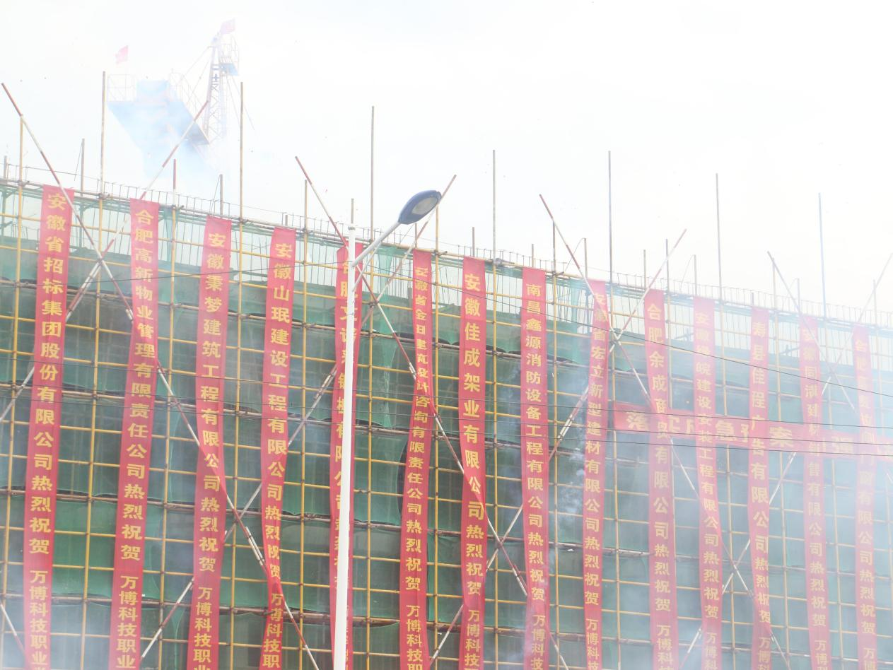 上午十时许,活动现场礼炮齐鸣、彩烟升腾,鞭炮声此起彼伏、响彻云霄,烟花五彩缤纷、绚烂绽放,封顶仪式开启,现场的人们欢欣雀跃,拍照留念……这一切,都寄托了四海宾朋和万博人对新桥校区的美好祝福。