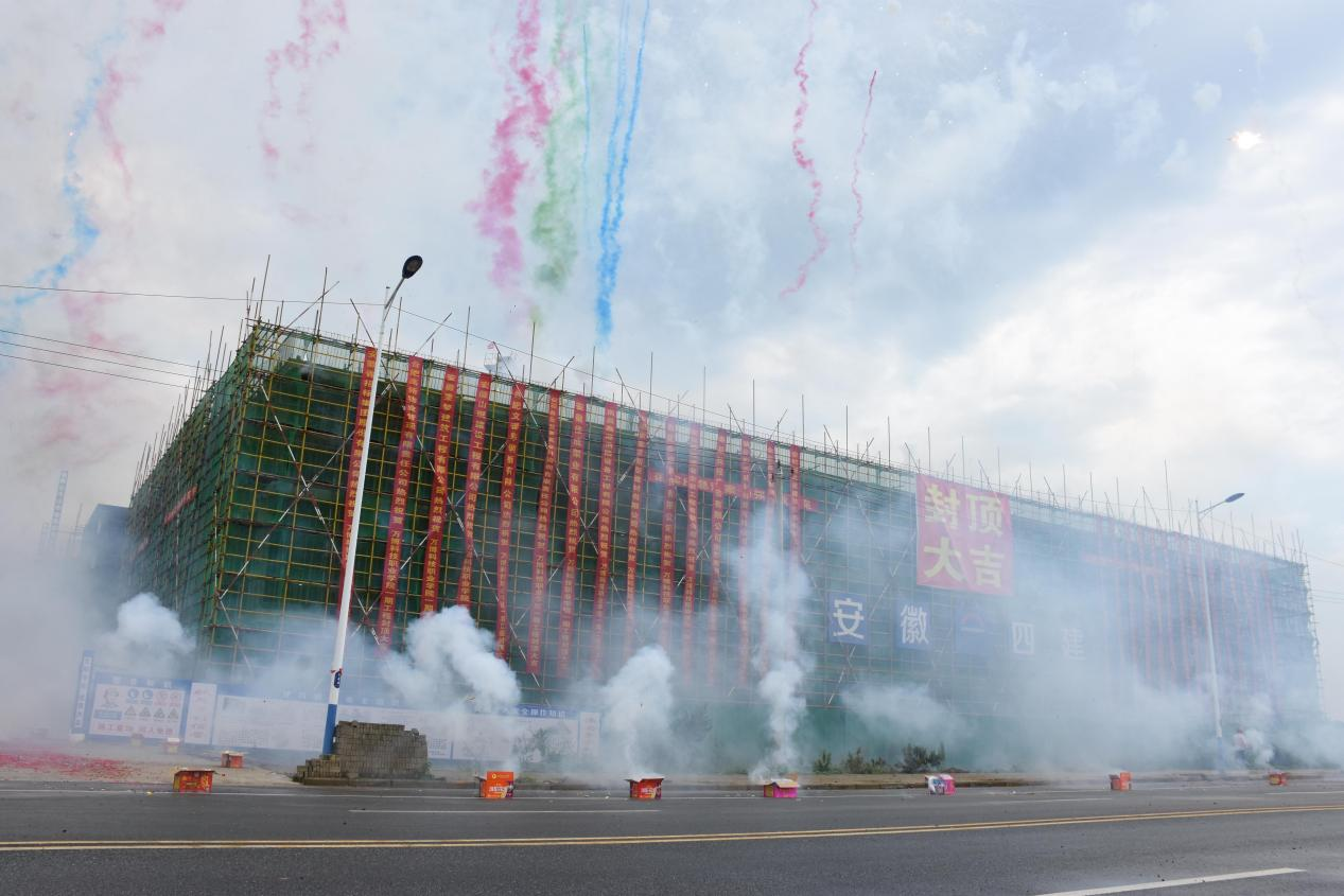 封顶活动现场,主体已被“封顶大吉”的大红幅和一条条红色祝福标语装点得格外喜庆!