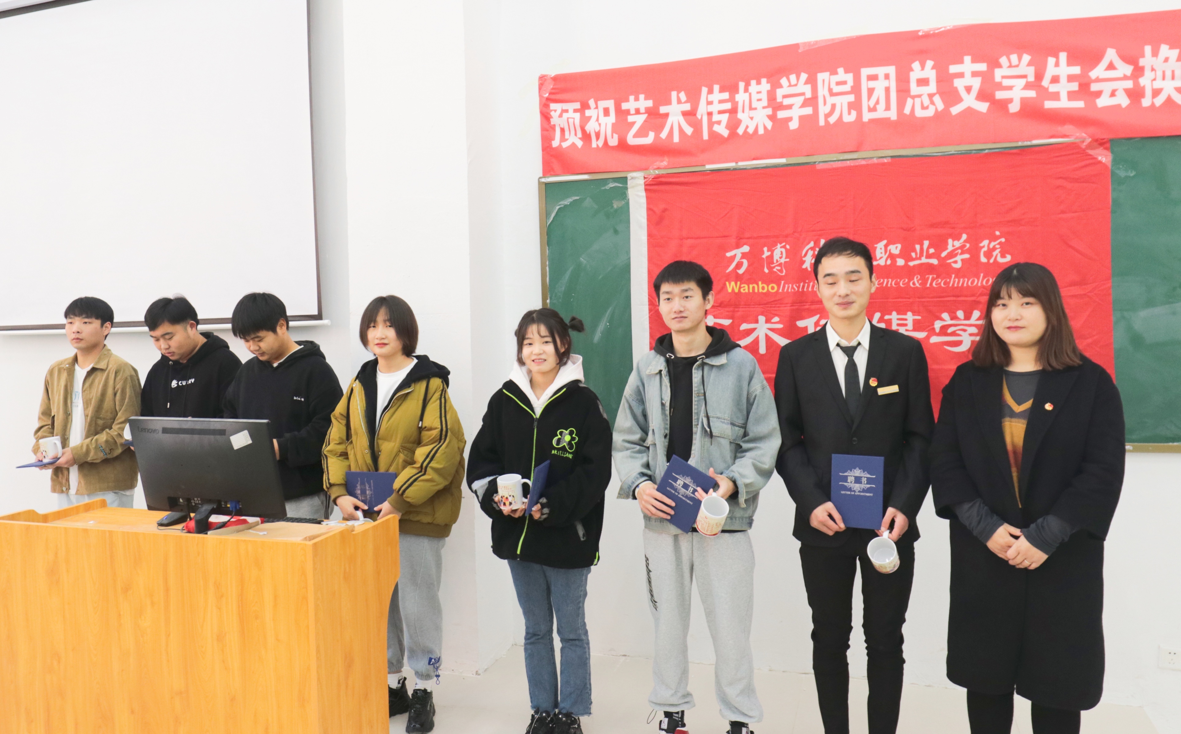 投票结束后,艺术传媒学院团总支书记杨萍萍为上一届学生会干部颁发聘书。