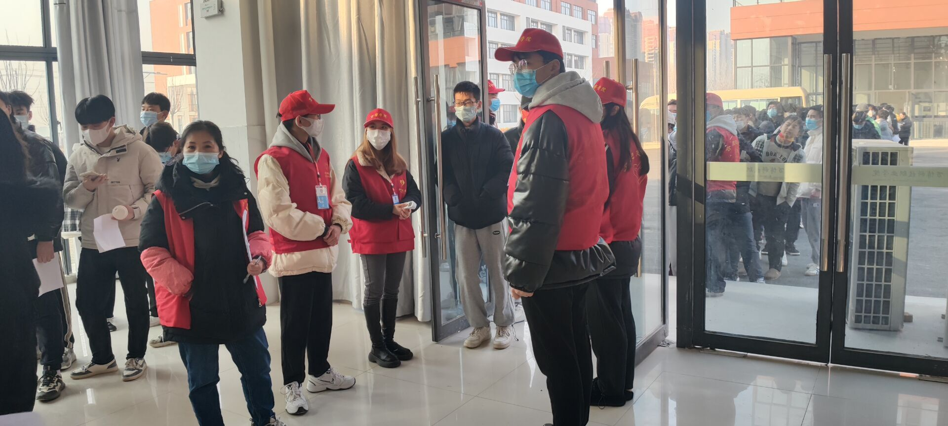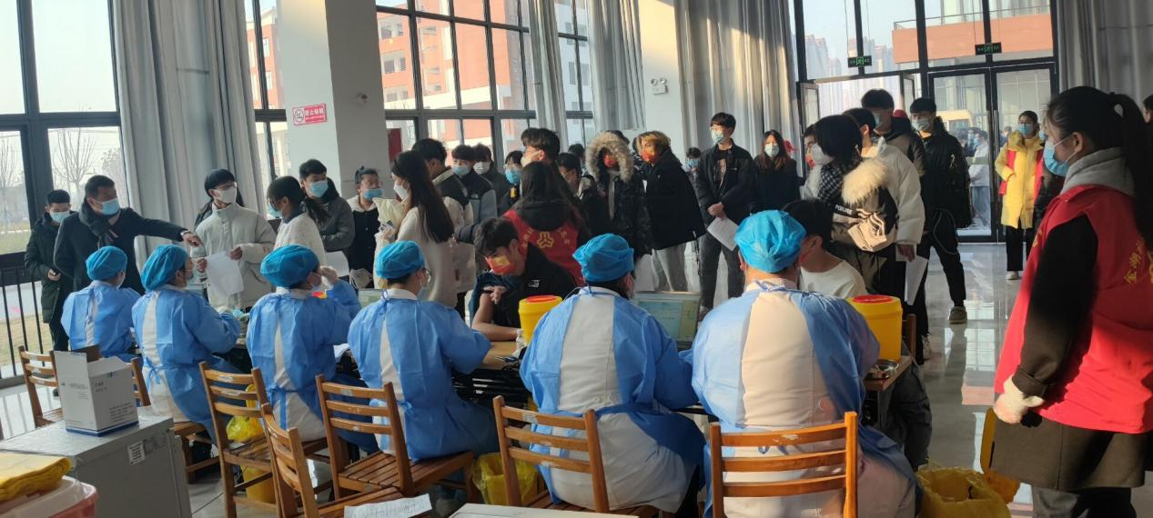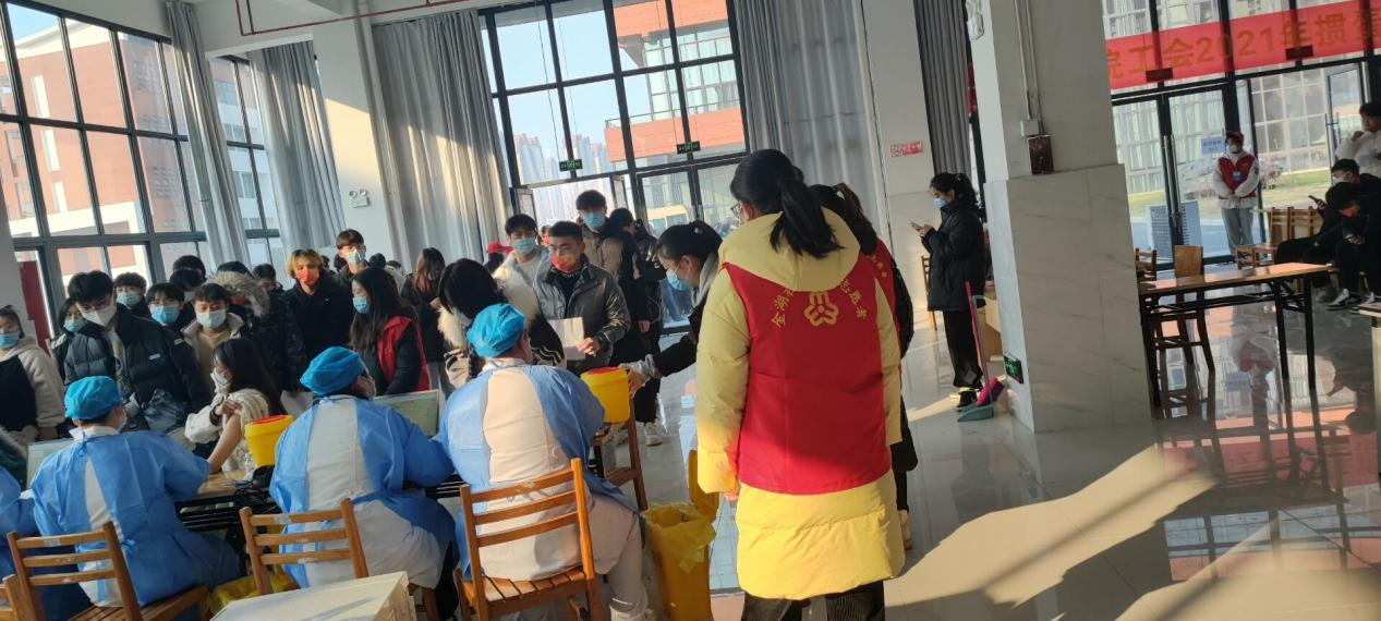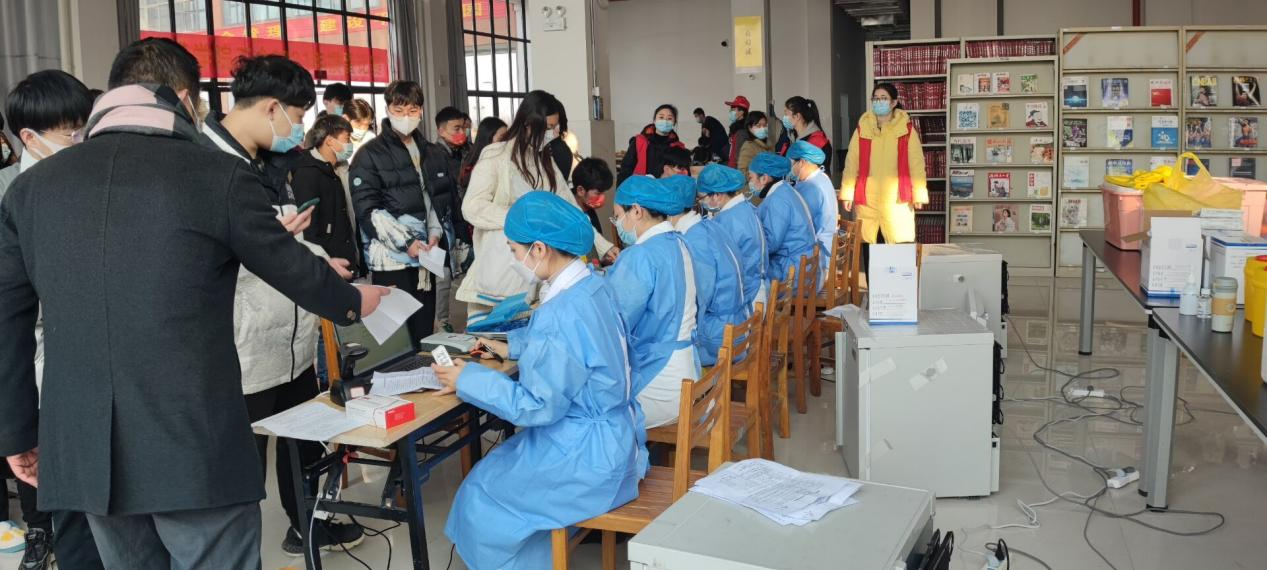 同学们以各二级学院为单位,在填好《新型冠状病毒疫苗知情同意书》后,由各班级辅导员及学院负责人带领到图书馆东一楼有序排队等待疫苗接种。现场志愿者们耐心指导,检测师生体温,并分别在等候区、接种处、留观区解答师生问题、提供帮助。教职工们也有序排队。医护工作者认真热忱服务。现场欢声笑语。