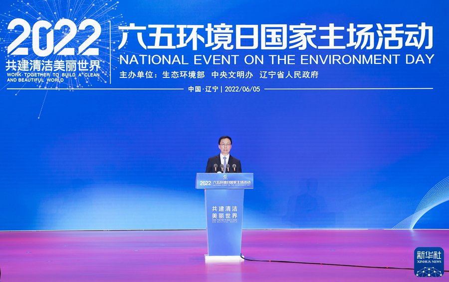 6月5日,2022年六五环境日国家主场活动在辽宁省沈阳市举行。中共中央总书记、国家主席、中央军委主席习近平发来贺信,向活动的举办表示热烈的祝贺。中共中央政治局常委、国务院副总理韩正在活动开幕式上宣读了习近平的贺信并讲话。新华社记者 李涛 摄