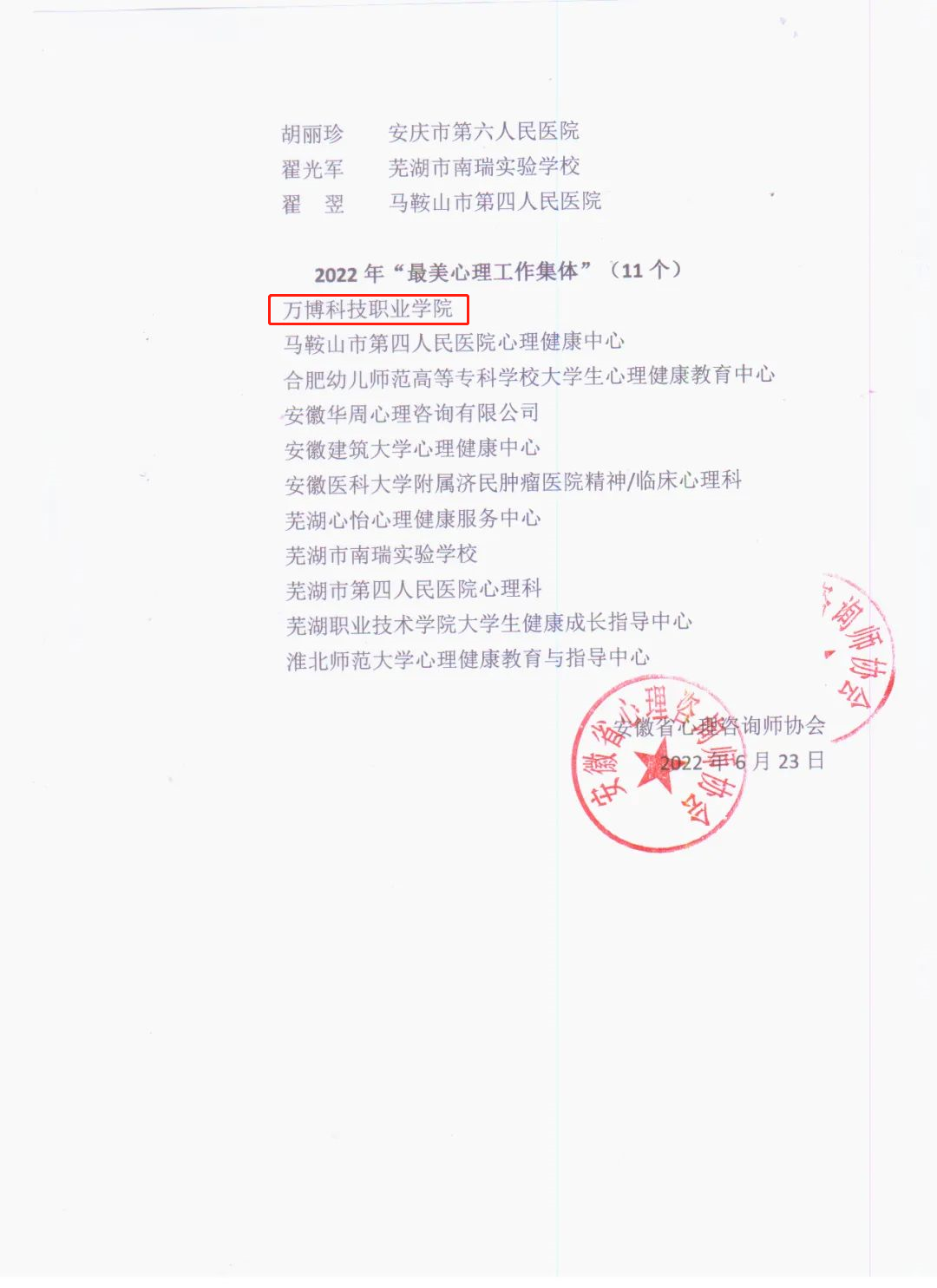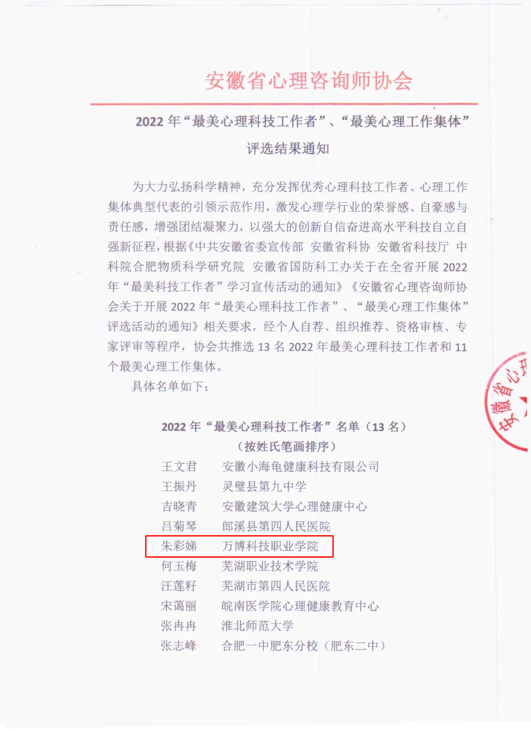 6月24日,经过层层选拔,BEAT365最终荣获2022年安徽省“最美心理工作集体”,朱彩娣老师荣获2022年安徽省“最美心理科技工作者”。