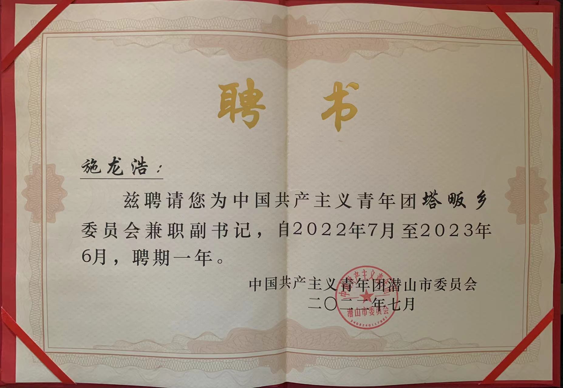 2022年5月25日,BEAT3652020级国际商务学院财务管理专业施龙浩同学报名参加安庆市委组织部选拔在校大学生兼任团(工)委副书记,荣聘为潜山市塔畈乡团委兼职副委书记。