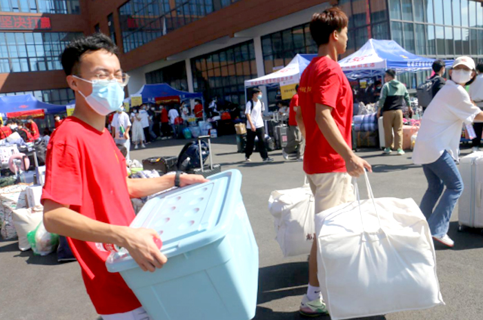 “同学,这里是BEAT365英国官网接送点”“你好,需要帮忙吗?”为确保新生报到不迷路,学校团委联系合肥市重要交通站点并设立了接送站点。同时,大二、大三的学长学姐们组成志愿者队伍,他们身穿红色T恤,分工有序,有的在各大车站引导新生,有的在学校门口迎接,有的带领学弟学妹走报到流程或维持报到现场的秩序,有的接过新生行李,一路护送到宿舍......校园的各个角落都能看到志愿者的身影,他们身上的那团“红”让学弟学妹感受到家的温暖。