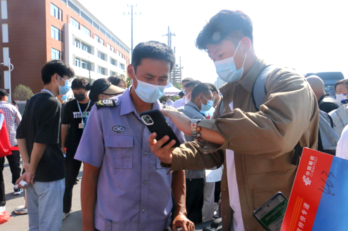 “请出示行程码、安康码、48小时核酸报告”“家长请放心,校园里有专员安排孩子行李......”疫情尚未完全散去,为保障校园安全,保卫处工作人员严格执行疫情防控措施,为新生测量体温、核验健康码、行程码等,同时还要安抚不能进入校园的新生家长。