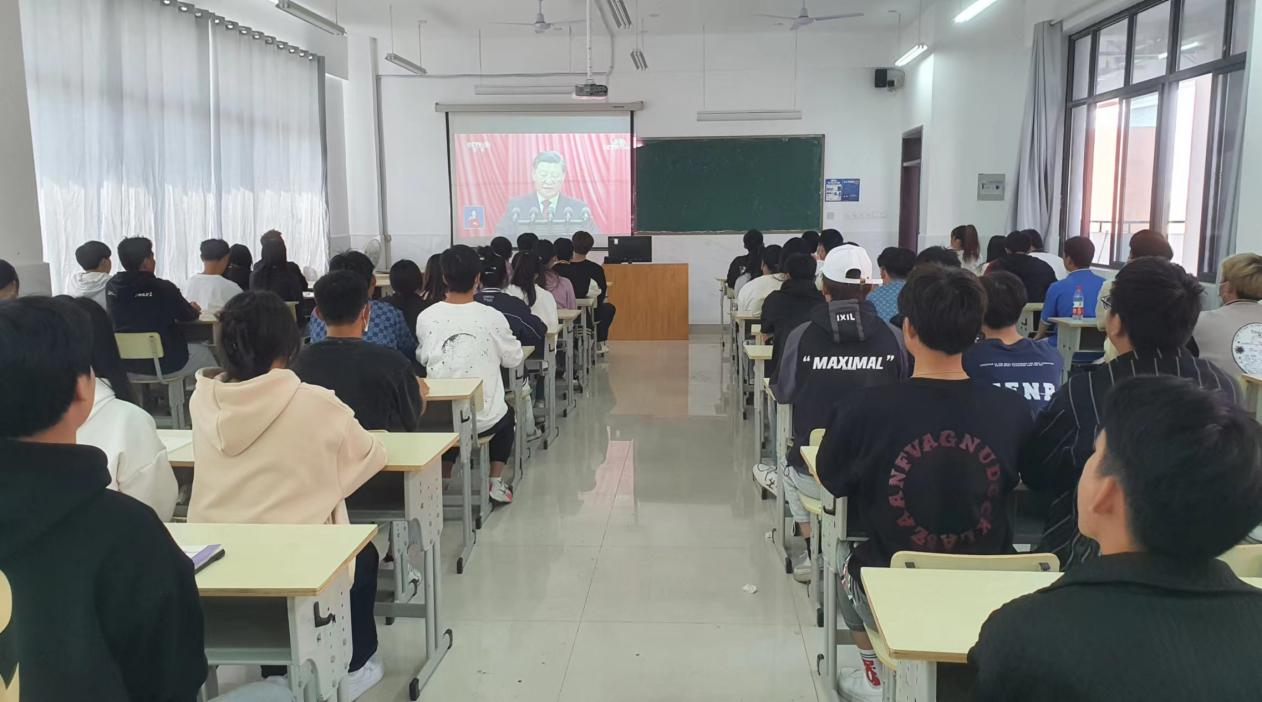 国际商务学院党支部于10月16日上午10点,在2401教室组织学院党员、团干、学干、班干以及青年学生采用集中和分散结合的方式,共计约300人共同观看党的二十大开幕会直播。大会开始,全体起立,奏唱国歌,在党支部书记司斌斌的带领下,同学们精神饱满高唱国歌。而后,全体师生怀着崇敬的心情为已故老一辈无产阶级革命家和革命先烈默哀。